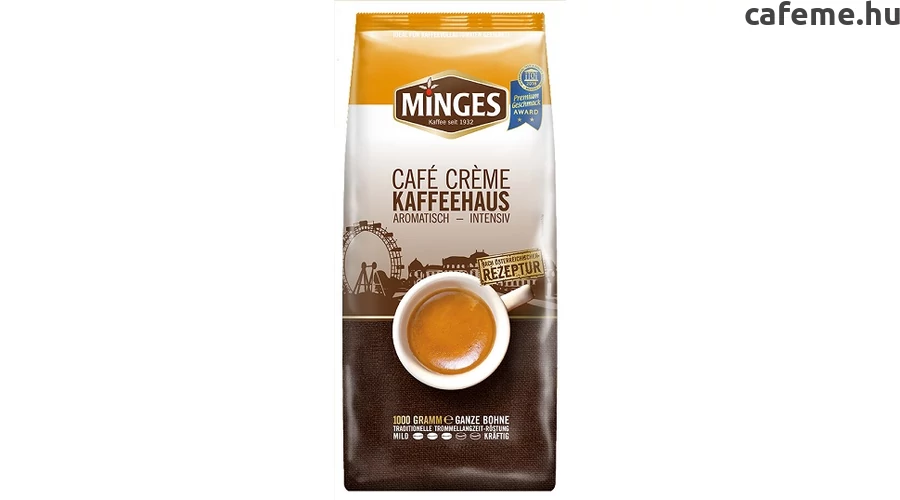A MINGES Caffé Créme Kaffeehaus szemes kávé kiváló robusta és a legjobb arabica termőterületekről származó kávék válogatásával készült. Jellegzetesen bécsi receptúra alapján pörkölt, 3-as pörkölésű fokozatú intenzív aromájú kávé. Különleges kávékészítmények a Mingestől! A tradícionális kávékészítés mesterei kezei közül csak a legjobb kávébabok kerülhetnek ki, mely minőséget és odafigyelést Ön is megtapasztalhatja otthonában! Kóstolja meg a Minges verhetetlen kávé ízeit!.Prémium ízvilágával azonnal belopja magát a bécsi kávét kedvelők szívébe. Ez a melange kávé kitűnően alkalmas Caffé Latte, Cappuccino tejes kávé készítéséhez. 2-es savasság jellemzi.